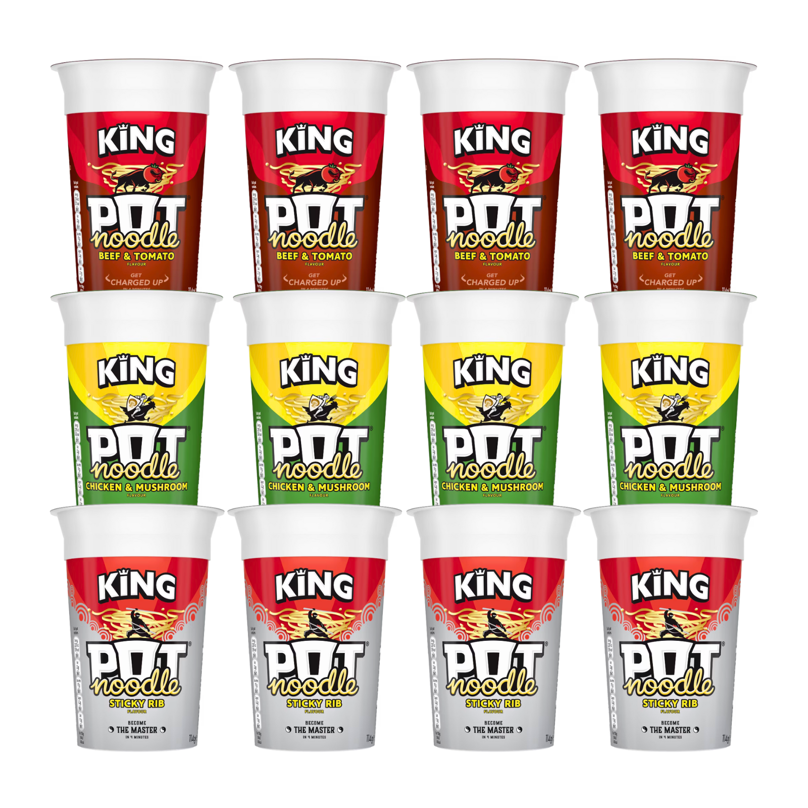 Flavour-packed trio of King-size Pot Noodles: Chicken & Mushroom, Beef & Tomato, and Sticky Rib