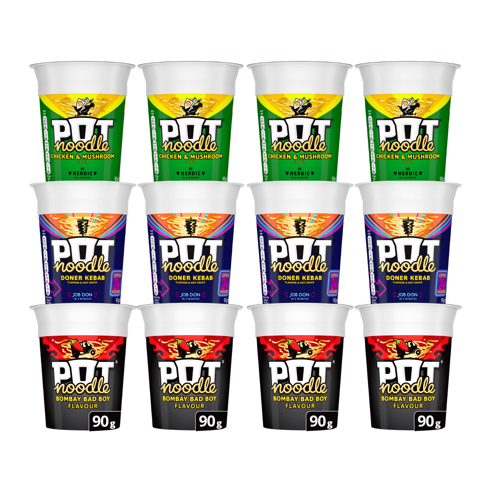 12X King Pot Noodles Chicken & Mushroom, Doner Kebab And Bombay Bad Boy Flavour 90g