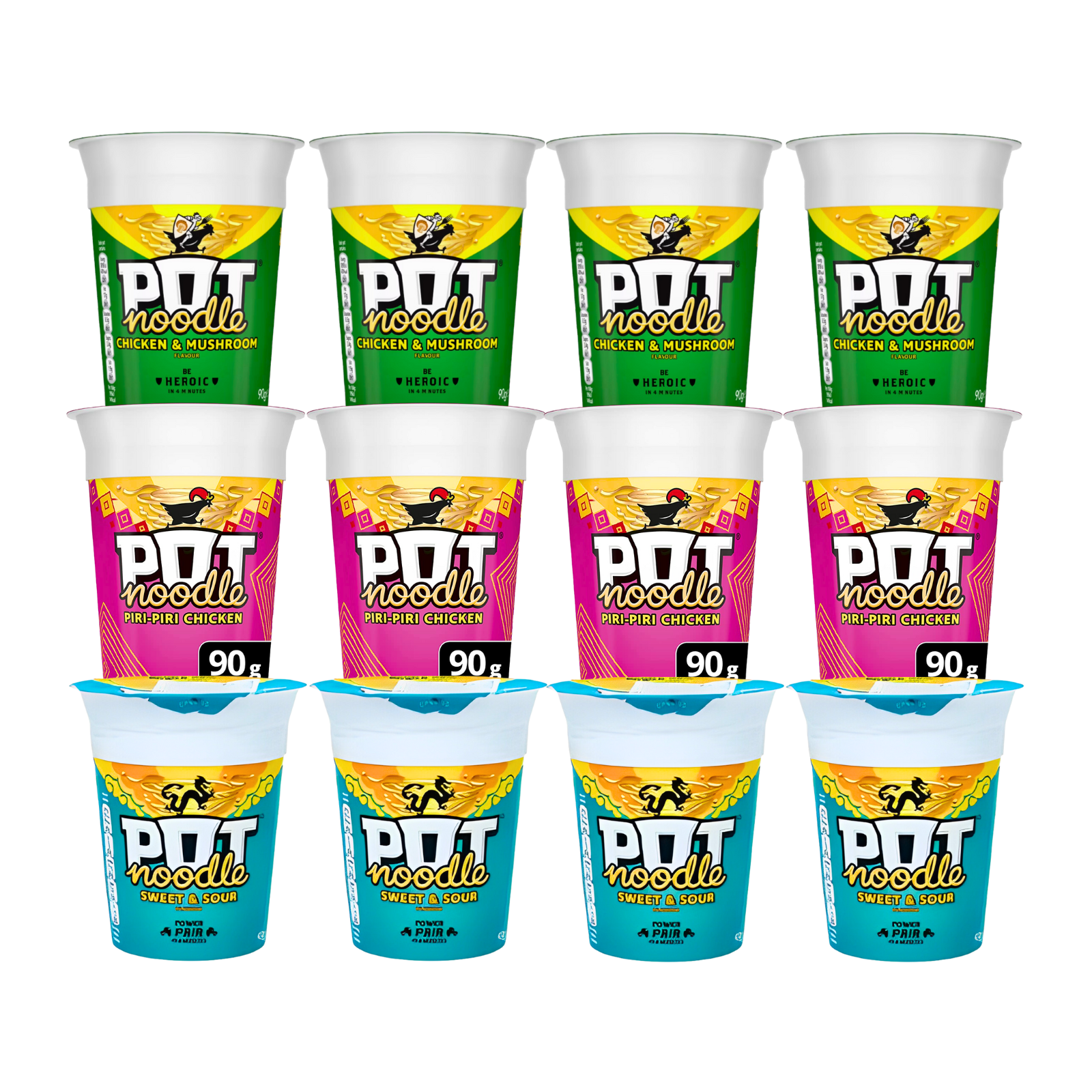 Tasty trio of King-size Pot Noodles: Chicken & Mushroom, Piri-Piri Chicken, and Sweet & Sour