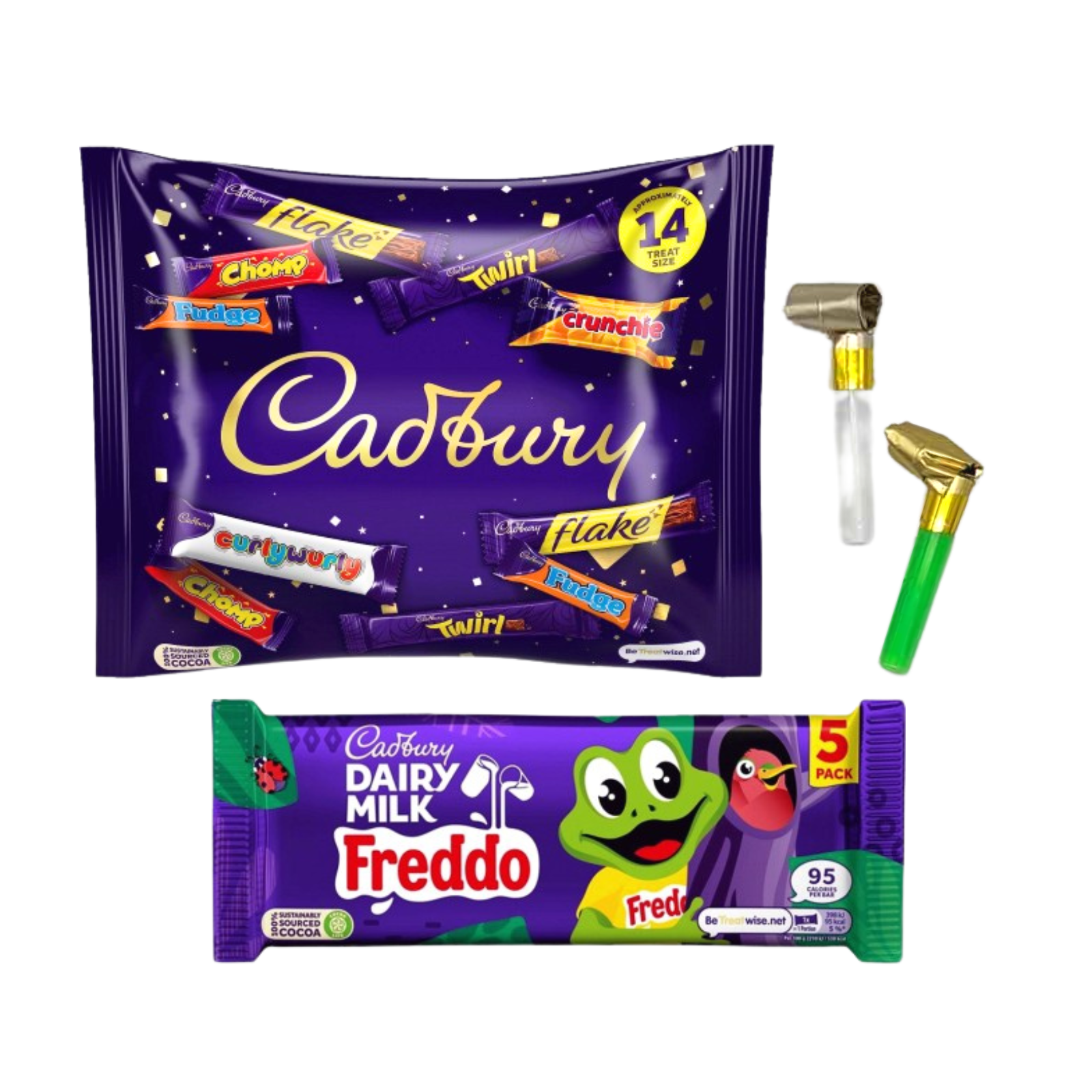 Cadbury Treats Bag: Assortment of mini Cadbury bars like Fudge, Crunchie, Dairy Milk, and more