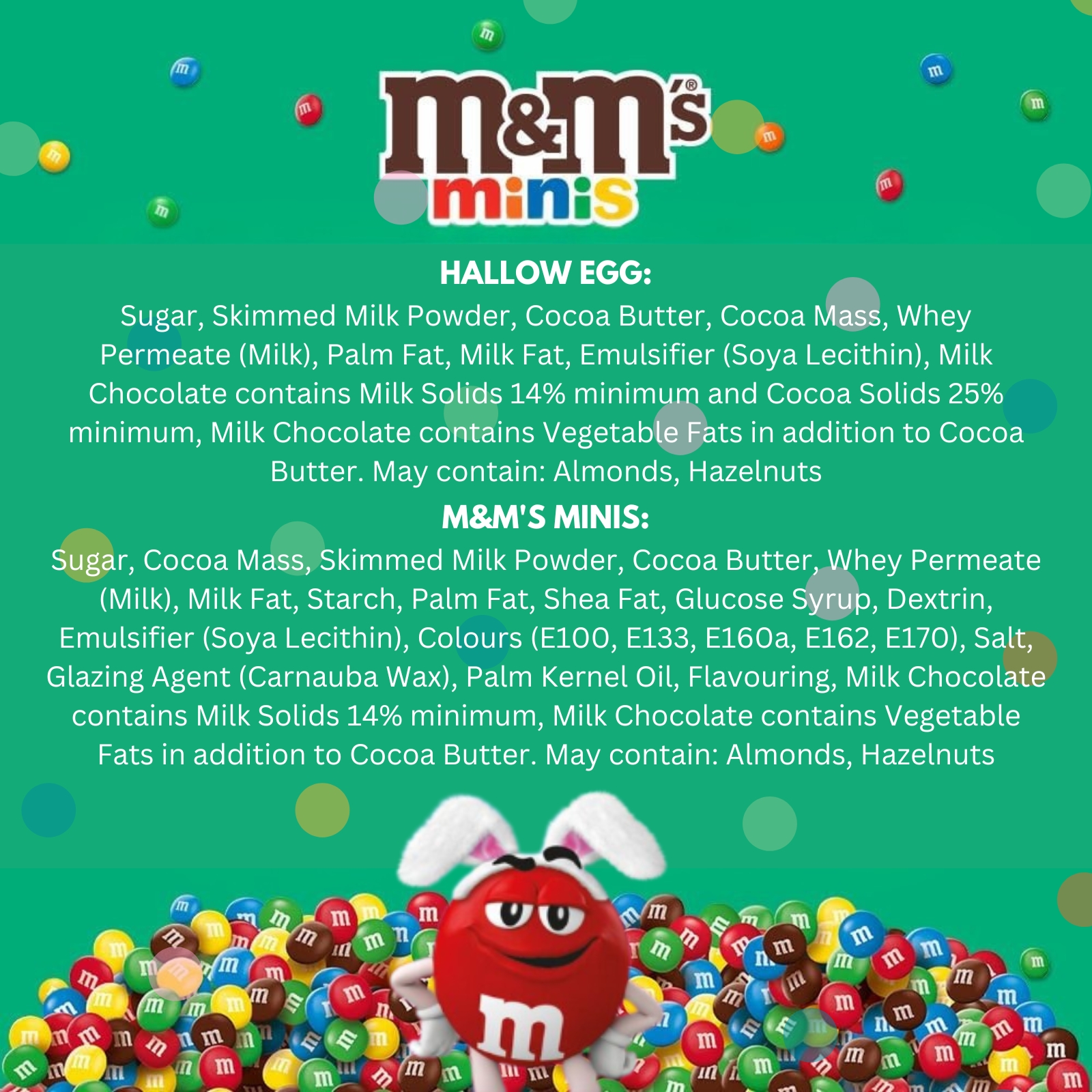 Includes M&M’s Chocolate Minis tube and a M&M’s Crispy Bunny Easter egg