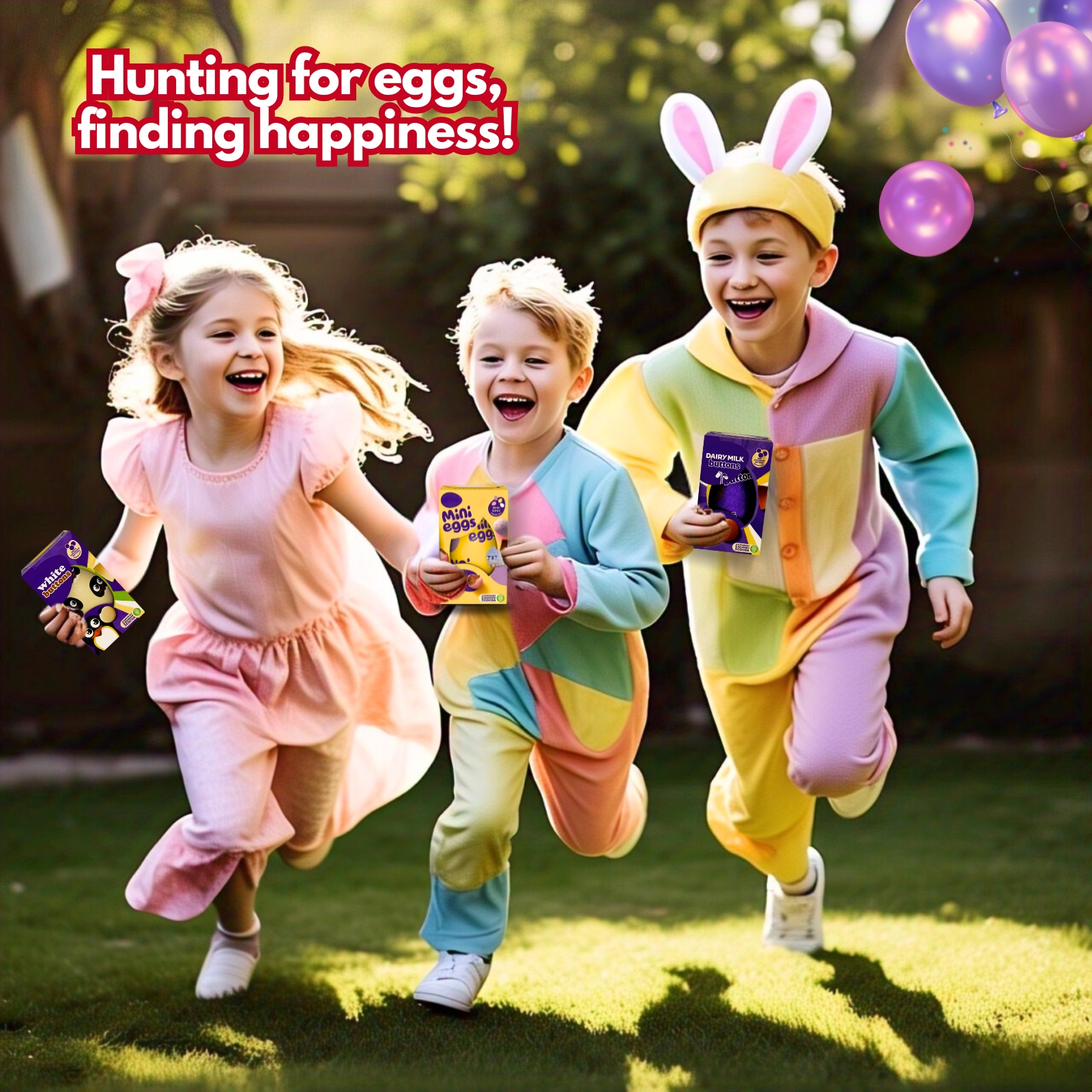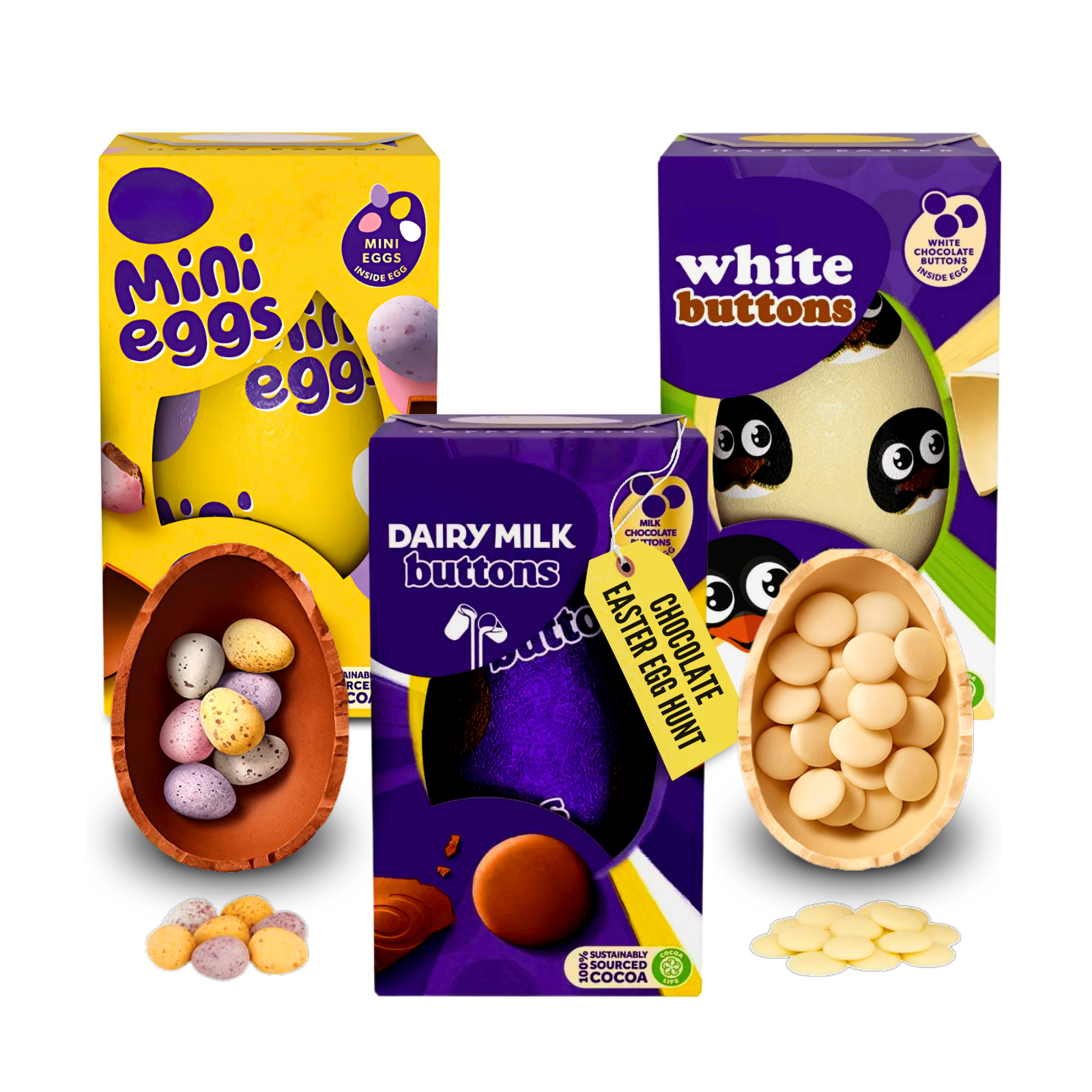 Includes 3 small Easter eggs: Cadbury White Buttons, Dairy Milk Buttons, and Cadbury Mini Eggs
