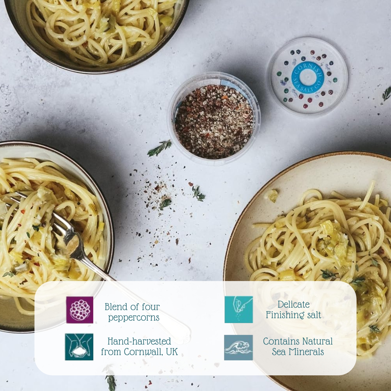 Blend of coarse Cornish sea salt with black, white, green, and pink peppercorns