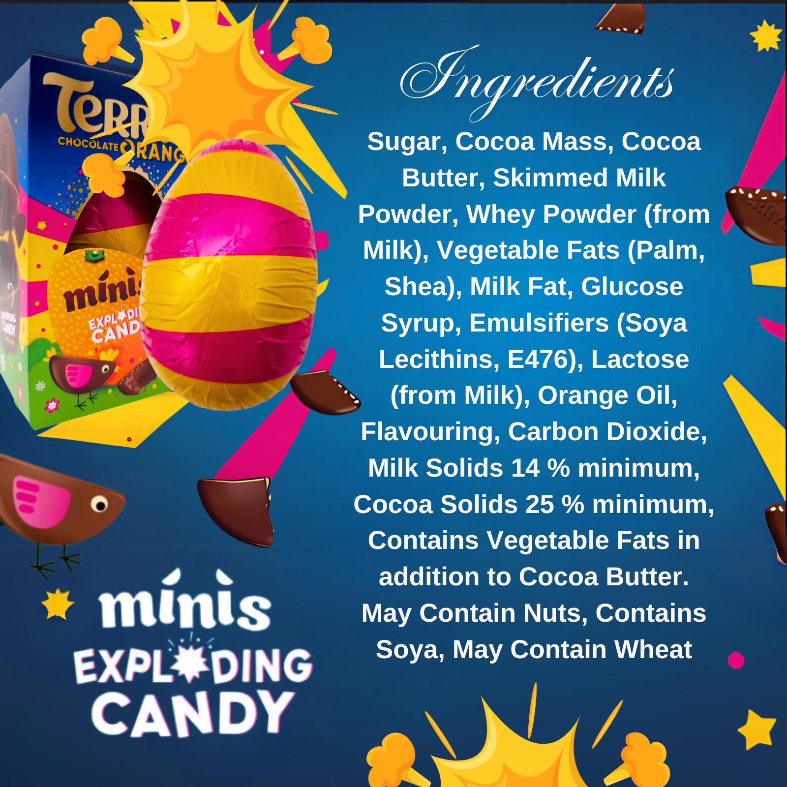 Includes 3 small Easter eggs: Smarties, KitKat Chunky, and Terry’s Chocolate Orange Mini Exploding Candy
