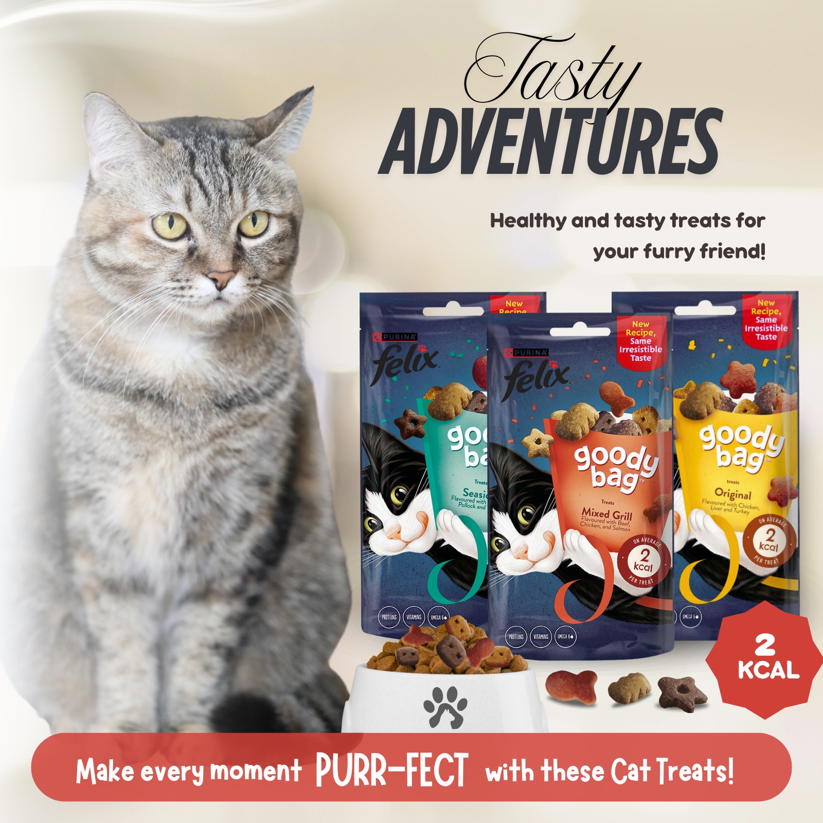 Tasty and crunchy treats your cat will love, available in Mixed Grill, Seaside, and Original varieties.