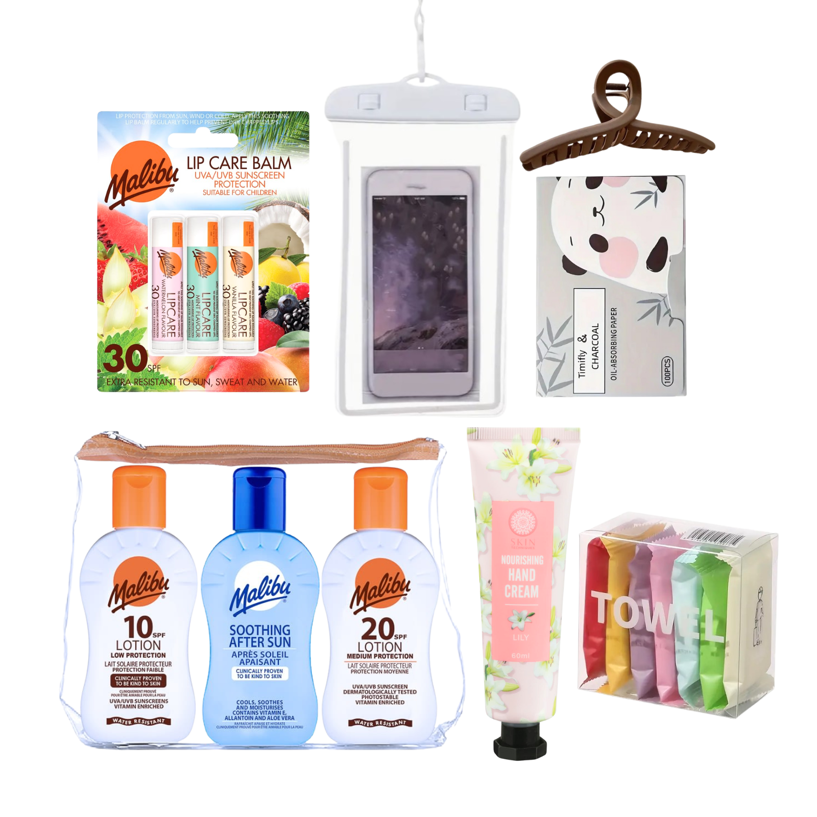 Includes a selection of sun protection and skincare must-haves (e.g., SPF lotion, lip balm, hair Clip, Compressed Towels – contents may vary)