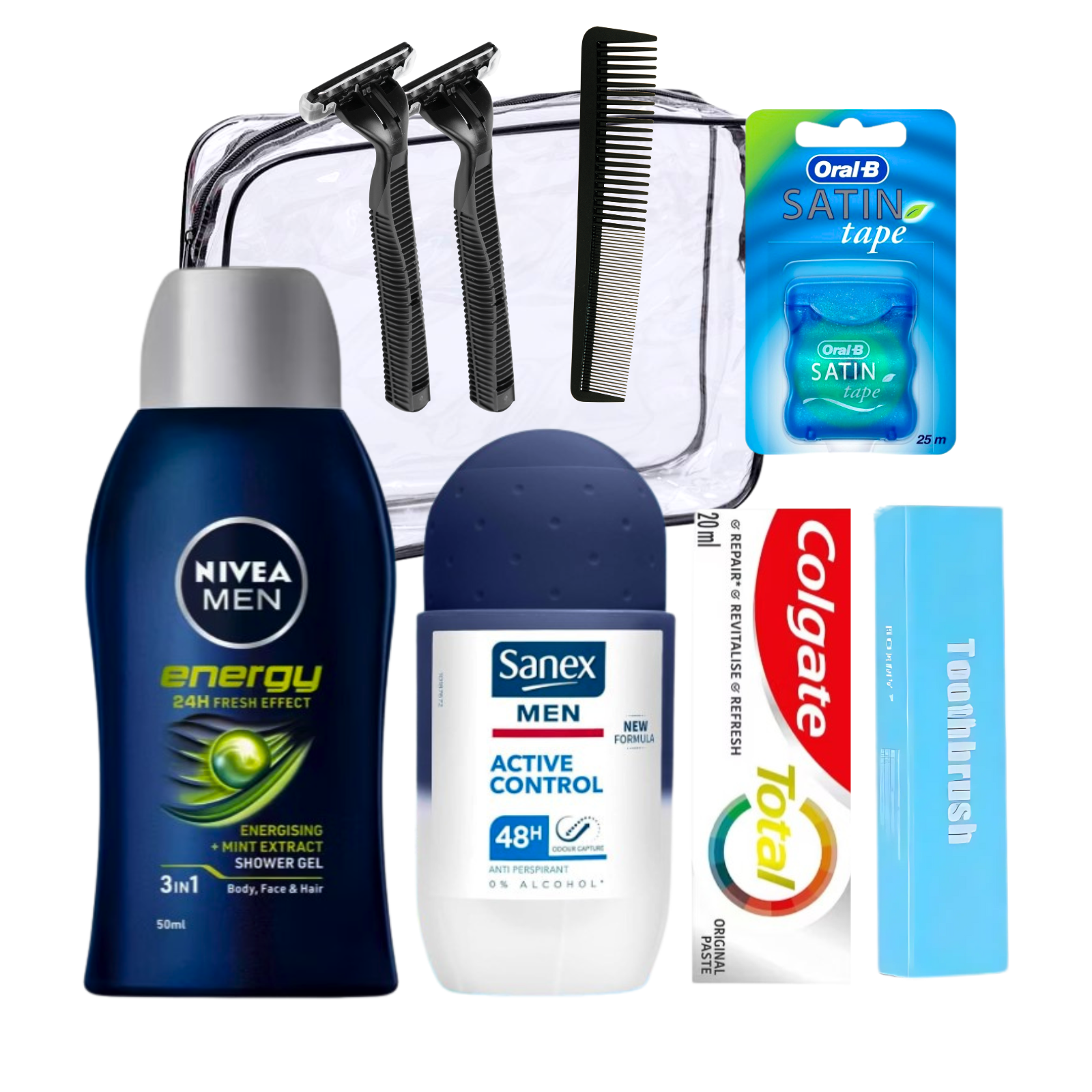 • Includes travel-size essentials such as Shaver, Shower Gel, Deodorant, toothpaste, and more.